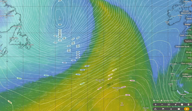 Oblast nejsilnějšího větru je daleko na severu. Našeho nejlepšího offshore jachtaře Milana Koláčka nezajímá tolik střed níže, jako studená fronta zasahující daleko na jih. Pluje z Karibiku do Evropy se svojí statečnou přítelkyní Pavlou. Je nedaleko Azor a frontou bude muset proplout. Zdá se, že vítr v poryvech bude foukat mezi 40 a 50 uzly. To je na pohodovou plavbu dost.