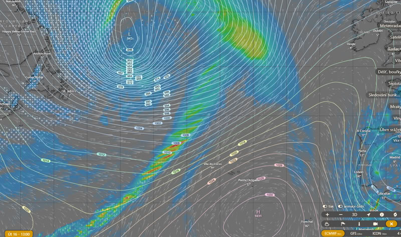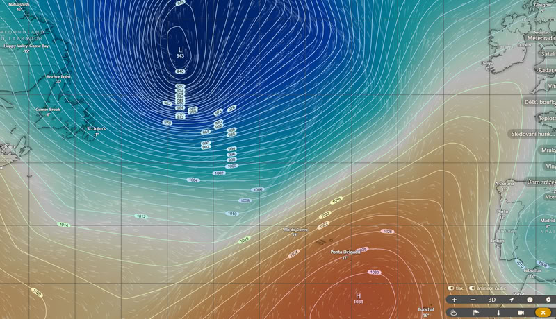 Pojďme se na tlakovou níži podívat blíže. Tlakový gradient je vidět na Windy na mapě tlaku. Je to sešup, proto tak silný vítr u středu níže. Mezi Azorskou tlakovou výší a touto níží je gradient téměř 90 hPa.